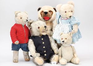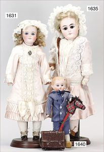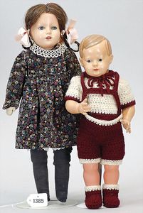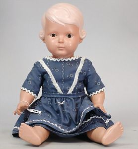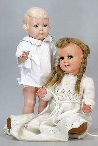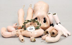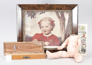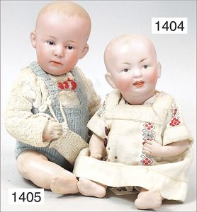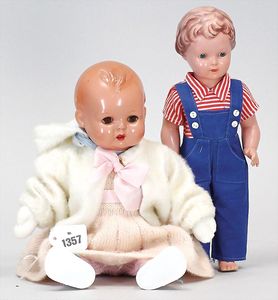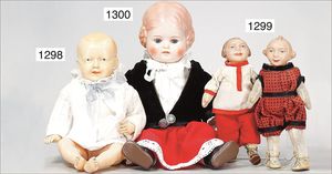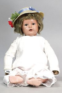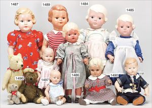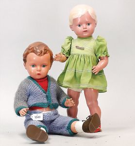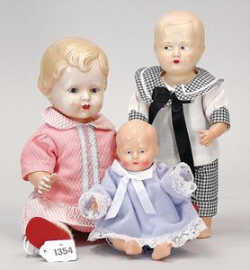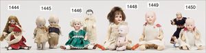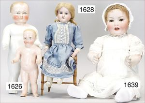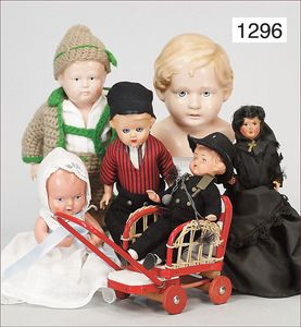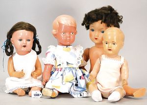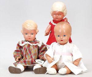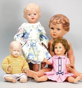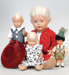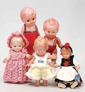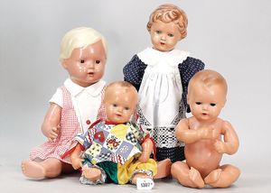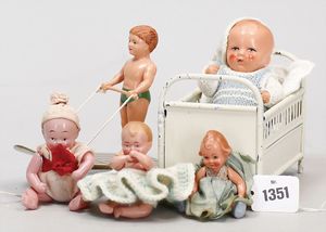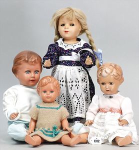 Konv. 4-teilig, CELBA, ernster Junge, 37 cm, Kurbelkopf, blaue Intaglioaugen, Sitzbabykörper, Nasenspitze ausgebessert, Augenbrauen nachgezogen, 1 SCHILDKRÖT Baby, Modell 310, Farbabweichungen am Körper, dazu 1 Massepuppe, 1 Inge, Celluloid, 42 cm, fester Kopf, gemalte Augen, Gummi lose