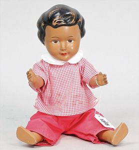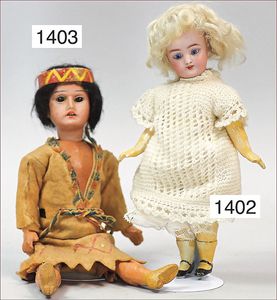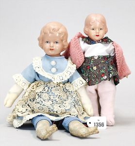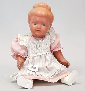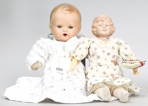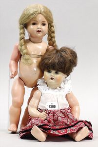 Konv. Celluloid, 1 x Brustblattkopf-Puppe, Modell Y, anmodelliertes Stirnband, seitl. blickende gemalte Augen, Stoffkörper, 38 cm, Kopf ausgebessert, Einbindekopfbaby, 42 cm, Celluloid