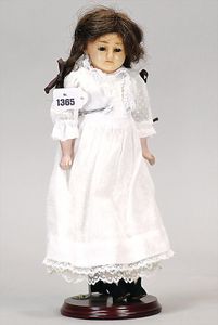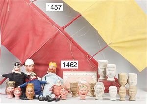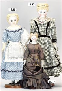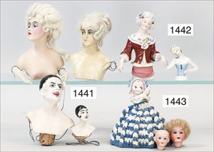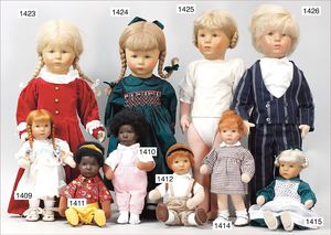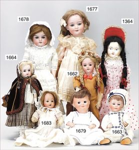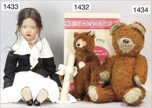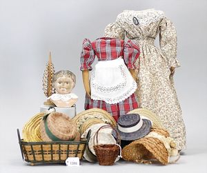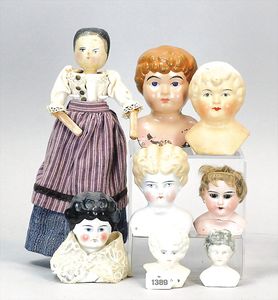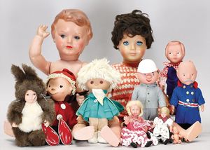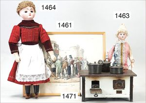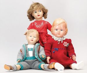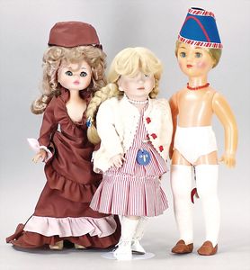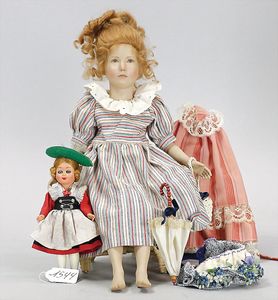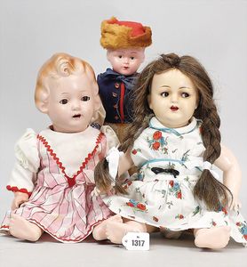 3 Teile, Puppen, Masse-Puppe, gemarkt KWF.1332, 36 cm, Einbindekopf, modellierte Haare, braune Schlafaugen, Transportrisiko für Augenmechanismus beachten, 1 Ecke im Auge weggeplatzt, bespielt, 1 Masse-Puppe, ungemarkt, 1 Trachtenpuppe, Riss am Kopf, Kunststoff