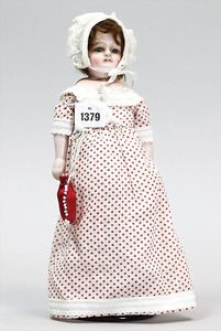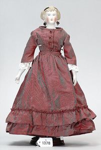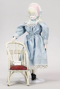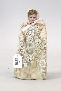 SIMON & HALBIG außergew. Biedermeier-Puppe, Brustblattkopf, blaue, fest eingesetzte Glasaugen, geschl. Mund, Parian, anmodellierte Haare mit Haarschleife, aufgemalte Kette mit angedeutetem Kreuz, Stoffkörper, Biskuit-Arme und -Beine, aufgemalte Schuhe, beide Daumen fehlen, Kleidung aus alten Stoffen genäht, 29 cm