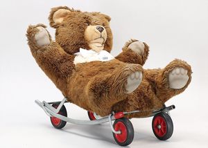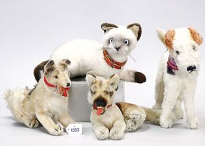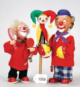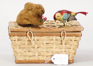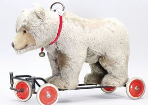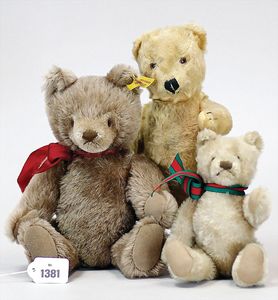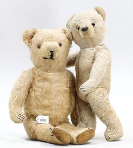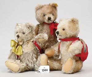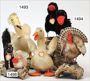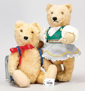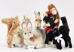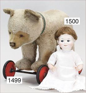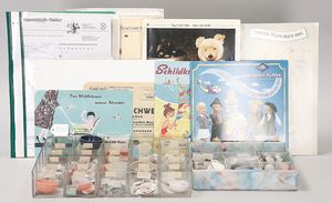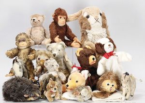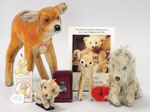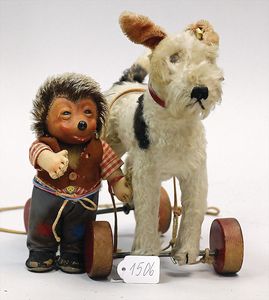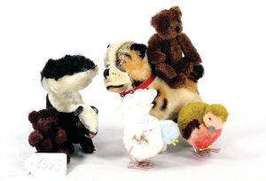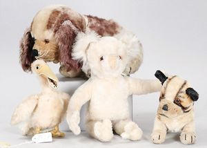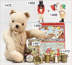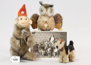 STEIFF Konv. Wittie, kompl., Knopf, Schild und Fahne, Steiff Terry, Knopf und Schild, 1 x Karl Affe, mit Schild, Uhrwerk intakt, geht jedoch etwas schwer, 1 x Orig.-Foto, Kinder in der Klosterschule, 20er Jahre, am Tisch sitzend, mit Spielzeug