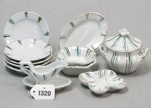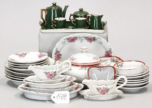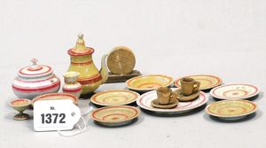 Puppenstuben-Speiseservice, 5 Teller, Durchm. 8 cm, Suppenschüssel mit Deckel, Sauciere, 3 Schalen, 1 x Gewürzschale