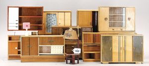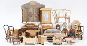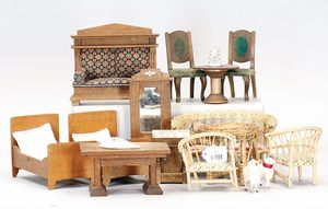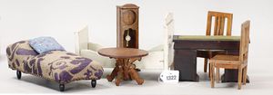 Konv. Puppenstuben-Möbel, 2 Stühle, Standuhr, Tisch, Sekretär, 2 Betten, 1920-1940, Länge der Betten 19,5 cm