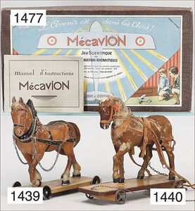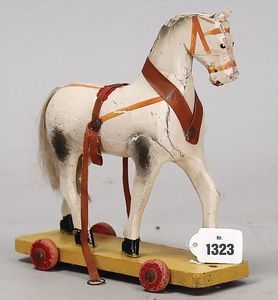 Pferd auf Holzrollen, wohl 30er Jahre, lackiert, auf Brett, 17 cm, bis auf kleine Stellen guter Zust.
