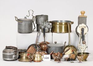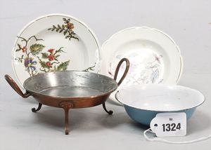 3-Bein, Pfanne, Kupfer, innen verzinnt, Durchm. 10 cm, 2 Zierteller, Keramik, Blumendekor, Durchm. 10 cm, 1 Henkelschale, blau-weiß emailliert