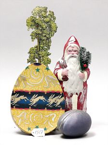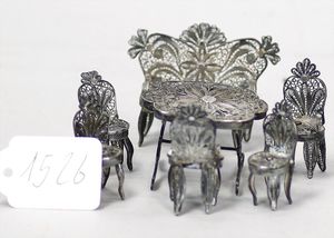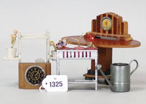 Fundkiste, Puppenstubenzubehör, Tisch, Biedermeier, oval, 12,5 cm lang, 2 Uhren, 20er Jahre, 2 Blumenbänke, 30er Jahre, 1 Zinnkanne jünger