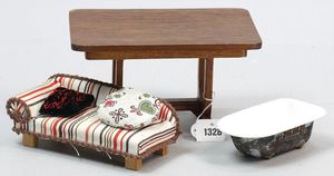 Konv. Puppenstubenausschmückungsteile, Badewanne, Guss emailliert, 13,5 cm, Tisch, 30er Jahre, 19 cm, 1 Sofa