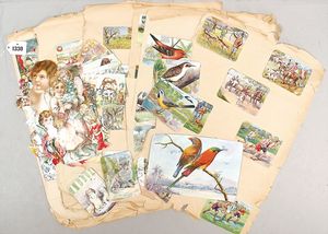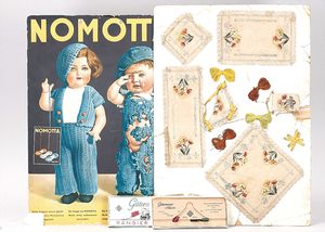 Tableau mit alten Stickvorlagen, dazu 1 Aufsteller Nomotta und 1 Gütermann Rangierspiel