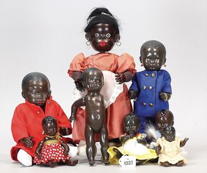 5 Teile, farbige Celluloid-Puppen, CELBA, Junge, 18 cm, SCHILDKRÖT, Strampelchen, Replika, 16 cm, CELBA, Junge, 22 cm, anmodellierte Haube, orig.?, CELBA, Junge, 14,5 cm, kleines SCHILDKRÖT, Strampelchen