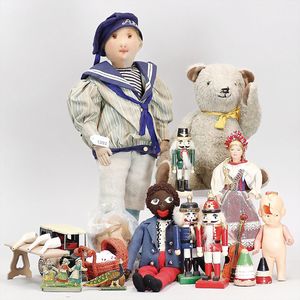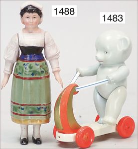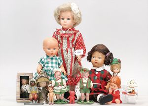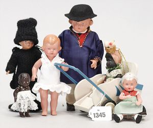 Konv. meist Celluloid, Schildkröt, Junge, 20 cm, Schildkröt, Strampelchen, 16/16,5 cm, kleine franz. Trachtenpuppe, 2 kl. Puppen, Kunststoff, 1 Kinderwagen