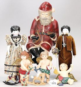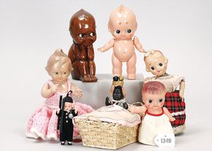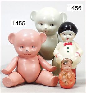 Konv. 5 Teile, Celluloid, 2 x Strampelchen, auf Holzstamm sitzend, 1 Puppe Celba, 2 x kleine Inge, 1 Puppe Celba