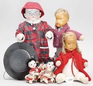 Konv. Puppenstuben-Puppen, Ganzbiskuit, 6 Teile, für Stube oder Schule, Charakterjunge, 10 cm, modellierte Haare, gemalte Augen, Mädchen, mit Glasaugen, 10 cm, 4 Puppen fester Kopf, modellierte Haare, Kleidung alt