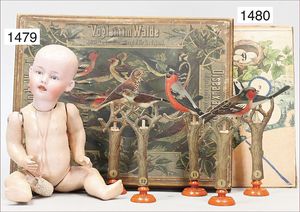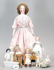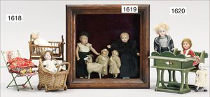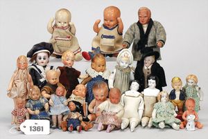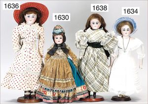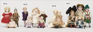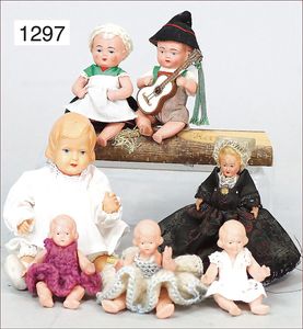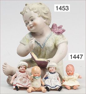 4 Teile Puppenstuben-Puppen, 8,5 cm, Kurbelkopf, gemalte Augen, Perücke, bewegl. Arme und Beine, 1 Mädchen 12,5 cm, Kurbelkopf, blaue gemalte Augen, Masse-Stehkörper, Trachtenkleidung, Junge Häkelkleidung, 11,5 cm, 1 x Mädchen, Ganzbiskuit, blaue Schlafaugen, 11,5 cm, Arme lose