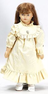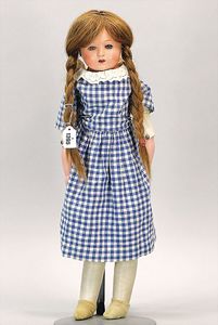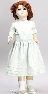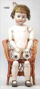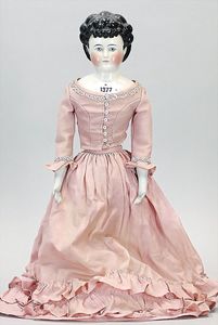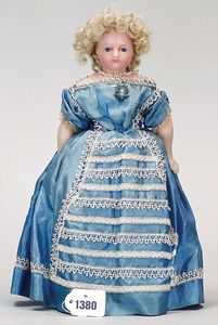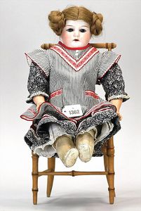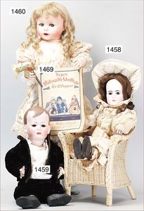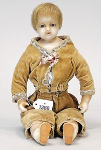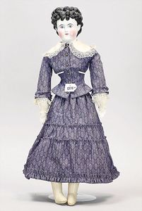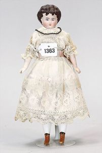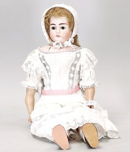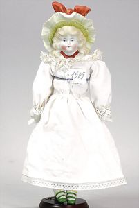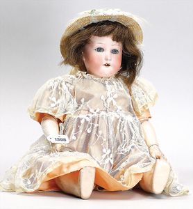 Biskuitporzellankopf-Puppe, 43 cm, Kurbelkopf, braune fest eingesetzte Paperweight-Augen, geschl. Mund, durchst. Ohren, früher Gliederkörper mit festen Handgelenken, alte Schuhe, alte Perücke, kl. Brandriss an der Kopfkrone