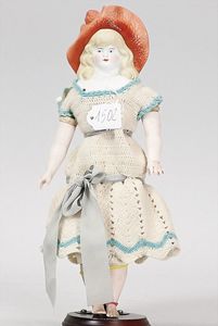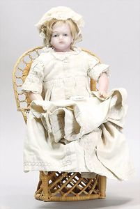 Biskuitporzellankopf-Puppe, gemarkt 182 4, 37 cm, Kurbelkopf, blaue fest eingesetzte Glasaugen, geschl. Mund, Kinngrübchen, Lederkörper, Biskuitbrustblatt, Biskuitarme, alte Perücke, außergew. Ausdruck