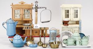 Puppenküchenteile, Porzellan, weiß, Mehlmetze, Backform, Kannen, Sauciere, dazu 2 Petroleumlampen, 1 x Kaffeemühle Blech, Blechschale