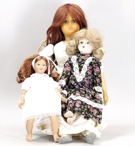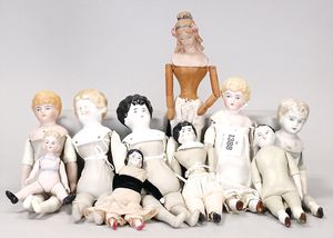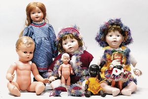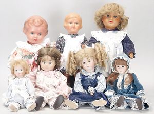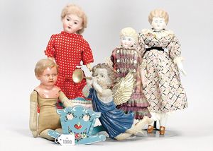 Konv. Celluloid und Tortulon, Ursel, Tortulon, 25 cm, gemalte Augen, stärker bespielt, 1 Ursel, Tortulon, 25 cm, guter Zust., MINERVA Mädchen, 29 cm, Kopf beschädigt, Inge, 15 cm