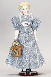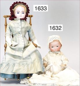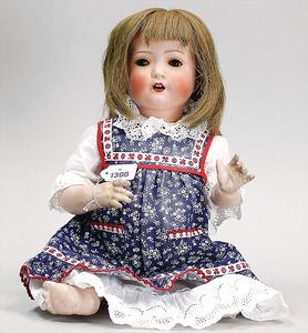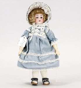 Biskuitporzellan-Brustblattkopf-Puppe, gemarkt 221-3, 34 cm, Beltentyp, blaue fest eingesetzte Glasaugen, geschl. Mund, Stoffkörper, Biskuit-Arme, altes Kleid, alte Perücke