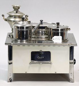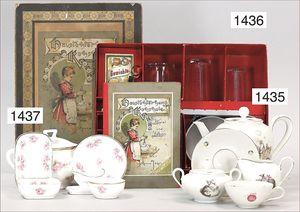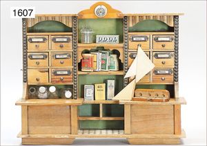 kl. Standkaufladen, ca. 1920, 39 cm hoch, 45,5 cm breit, Schubladen mit Blechschildern, schöner Orig.-Zust., einige Teile Zubehör