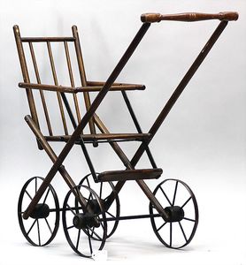 3 Teile Puppenstuben-Puppen, 2 x Ganzbiskuit, 1 x Biskuit-Kopf, -Arme und -Beine, Stoffkörper, kl. Bett, Wiege, 1 Kinderwagen, Länge Wiege 11,5 cm