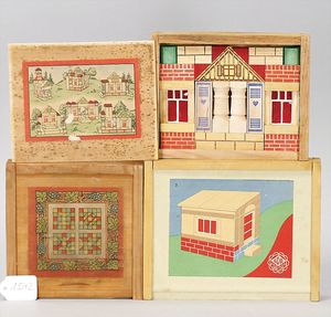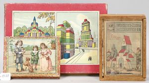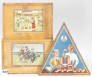 3 Holzbaukästen, komplett, 1 x Aufschrift französischer Baukasten