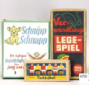 3 alte Spiele, 1 x Verwandlungslegespiel von Erbo, Schnipp Schnapp Schnittspiel Nr. 6002, 1 x Tischfussball, 6 Holzfiguren Fa. Meto