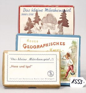 3 Kinderspiele, 2 x Märchenspiel: Hase und Igel und Hänsel und Gretel, dazu geograph. Quartettspiel, auf Vollständigkleit nicht überprüft