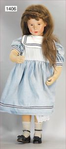 Papiermaché-Brustblattkopf-Puppe, 38 cm, blaue fest eingesetzte Glasaugen, ausmodellierte Haare, Stoffkörper, Masse-Arme und -Beine, aufgemalte Schuhe und Strümpfe, Kleidung alt oder aus alten Stoffen genäht, Farbfehler am Kopf, Nasenspitze berieben, ausgefallen