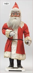 Papiermaché, wachsüberzogene Brustblattkopfpuppe, 40 cm, blaue Schlafaugen, geschl. Mund, Stoffkörper mit Druckstimme, Masse-Arme und -Beine, aufgemalte Schuhe, Kleidung alt oder aus alten Stoffen genäht
