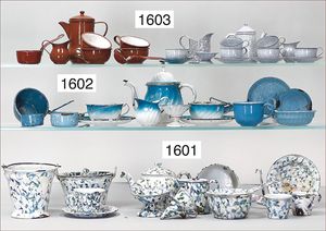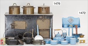 Konv. 13 Puppenküchenteile, Blech, blau/grau gesprenkelt, emailliert, Kaffeekanne, Töpfe, Pfanne, Eimer, Tassen, Milchkanne, Sieb, Höhe Milchkanne 6 cm, teils Emaille-Abplatzer, seltenes Muster