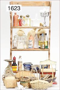 gr. Konv. Zubehör, für Materialwarenladen, Körbe, Säcke, Glas und Blechteile, dazu 1 Regal