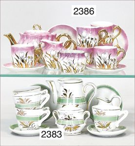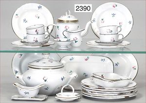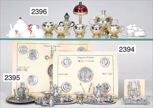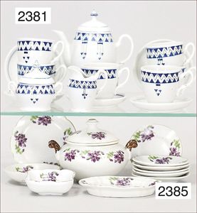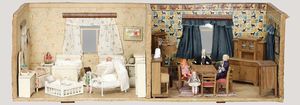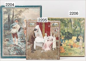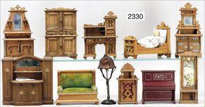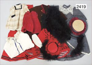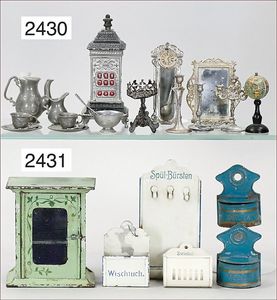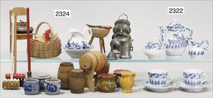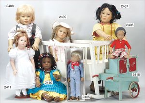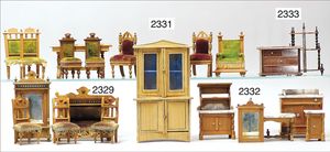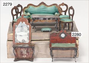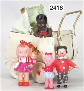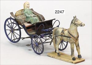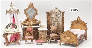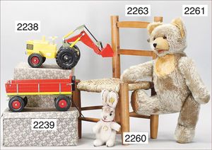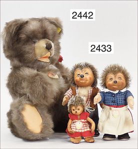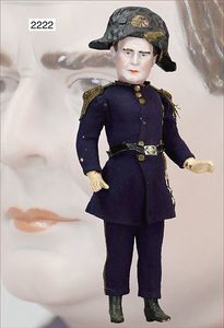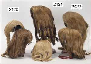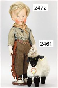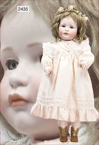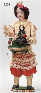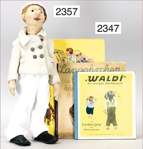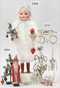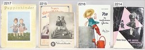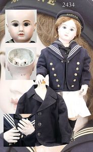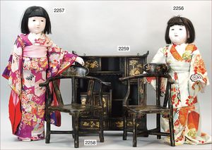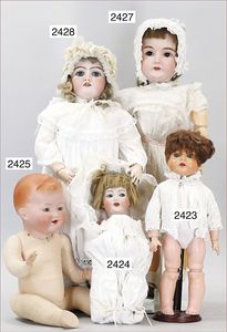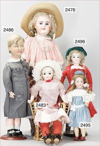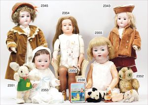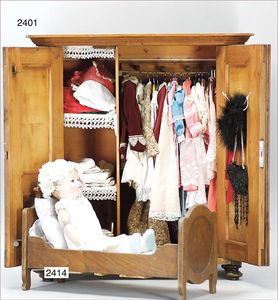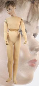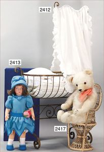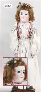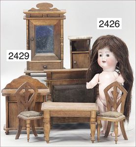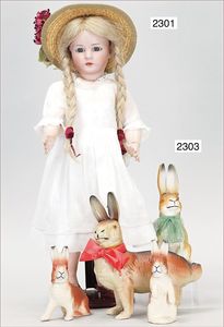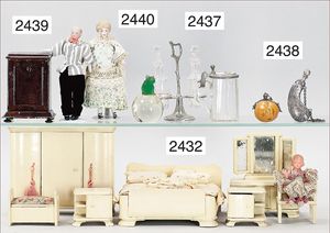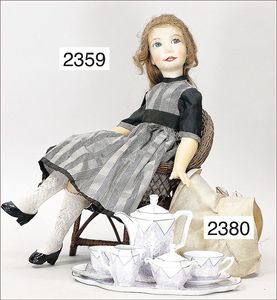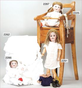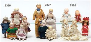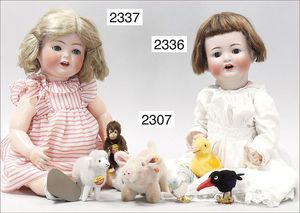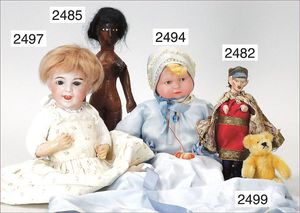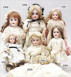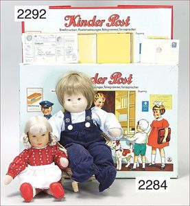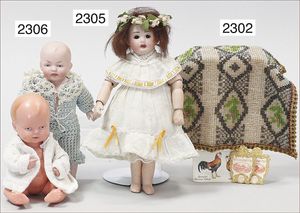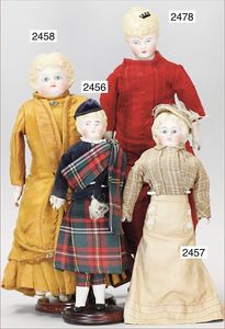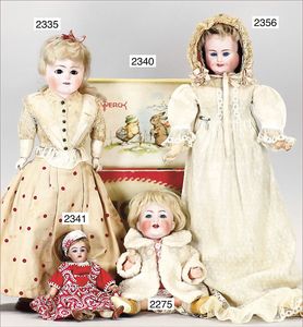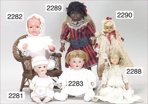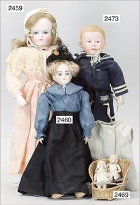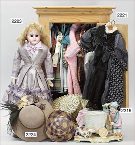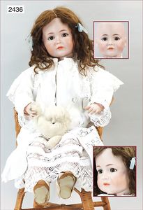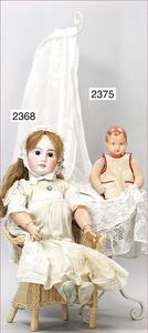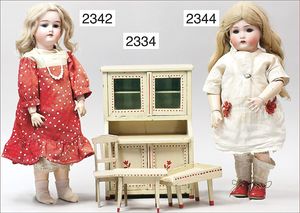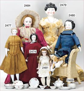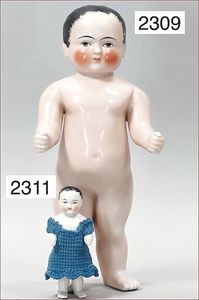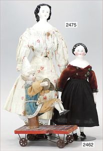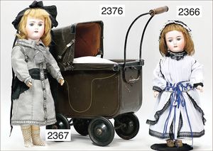 BIEDERMEIER Biskuitporzellan-Brustblattkopf-Puppe, glasiertes Porzellan, feine, ausmodellierte Haare mit angedeutetem Haarnetz, blaue, gemalte Augen, geschl. Mund, kl. Chip über der linken Augenbraue, Biskuit-Unterarme, Stoffkörper, 37 cm, dazu Biedermeier-Puppe, Biskuitporzellan-Brustblattkopf, glasiertes Porzellan, blaue, gemalte Augen, geschl. Mund, ein wenig Farbverlust an den Haaren, Biskuit-Unterarme und -Beine, 1 Arm ergänzt, 1 Fuß geklebt, Fußspitzen weggebrochen, 27 cm