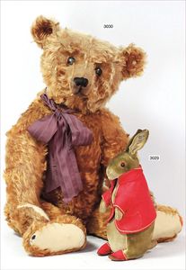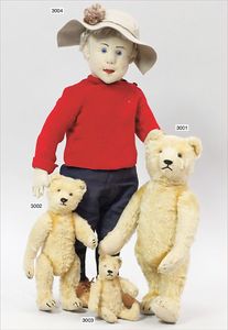 STEIFF Puppe Irine, von 1989, limitierte Auflage mit Bär und Hut, Brustschild, Knopf als Ohrring im Ohr, Orig.-Zust., 50 cm