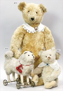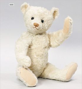 STEIFF Bär, ca. 1910, mit blankem Knopf, Reste der weißen Fahne, Glasaugen, helle Nasenbestickung, weißes Mohair, an vereinzelten Stellen etwas ausgegangen, lange abgeknickte Arme, Buckel, Filztatzen in sehr gutem Zust., 41 cm, sehr schöner Ausdruck