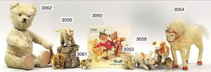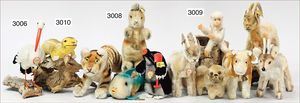 STEIFF Konv. 6 Teile, 1 x Kuh, mit Knopf, stehend, 12 cm, 1 x Rentier, 13 cm, mit Knopf und Resten der gelben Fahne, 1 x Pekinese, mit Knopf, Reste der gelben Fahne, 1 Affe, mit Knopf, 1 x Rocky, mit Brustschild, 15 cm stehend, mit Knopf, Brustschild und Fahne, Nr. 1620/14, 1 Rocky mit Brustschild, 15 cm