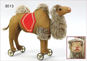 STEIFF Kamel, ca. 1895, Knopf mit Druckbuchstaben, minim. Reste der weißen Fahne, auf Metallrädern, Hals und Höcker Mohair, Filz in gutem Zust., minim. verblichene Stelle an der Schnauze, 35 cm, sonst sehr schöner Zust.