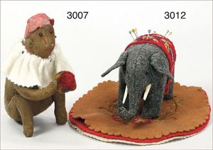 STEIFF Elefant, Nadelkissen, um 1893, Filzfarben in sehr gutem Zust., teilw. handgestickte florale Muster, 1 Stoßzahn abgestoßen, 13 cm, Schwanz fehlt, schöner Orig.-Zust.