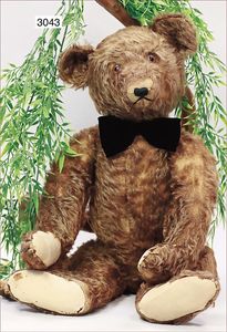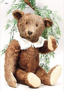 STEIFF 1920, Bär mit Knopf, mini. Reste der weißen Fahne, Glasaugen, dunkelbraunes Mohair, an vereinzelten Stellen starker Mohairverlust, Filztatzen ausgebessert, 63 cm, lange abgeknickte Arme, Kiepstimme intakt