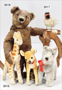 STEIFF Konv. 3 Teile, 1 x Bambie, mit Knopf, Reste der gelben Fahne, 21 cm, 1 x Hund, Schnauzer mit Knopf, 24 cm, stehend, 1 x Giraffe, mit Knopf und gelber Fahne, Nr. unleserlich, 28 cm stehend