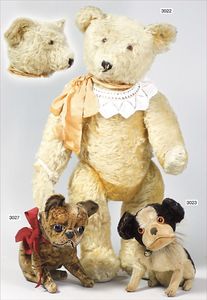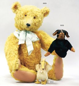 STEIFF Bär, ca. 1930, mit Knopf, langgezogenes F, minim. Reste der roten Fahne, maisfarben, Glasaugen, lange abgeknickte Arme, kl. Buckel, Filztatzen bis auf kl. Stellen in gutem Zust., 31 cm, schöne kräftige Farbe, kl. Stelle am Hinterkopf Mohairverlust, sonst sehr gut