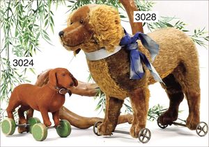 STEIFF Spitz, um 1900, mit blankem Knopf, minim. Reste der weißen Fahne, auf Metallrädern, rote Kordel mit 2 Quasten, Filzgesicht in gutem Zust., 27 cm hoch, schöner Orig.-Zust., schönes volles Mohair