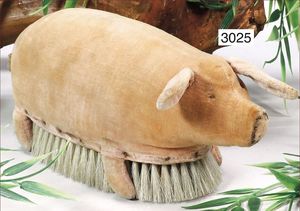 STEIFF Bürstenschwein, hergestellt 1909, rosa Samt, karikiert, auf 16 cm langer Kleiderbürste stehend, Augen fehlen, sonst in schönem Orig.-Zust., selten