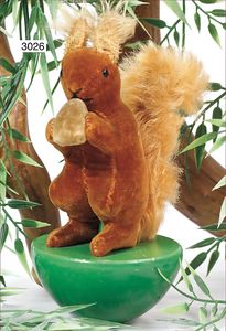 STEIFF Stehauf Eichhörnchen, aufwartend, Samt, auf farbigem Holz-Kegel, 4410, rot/braun, ca. 1939, Stehhöhe 12 cm, schöner Orig.-Zust.