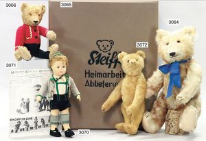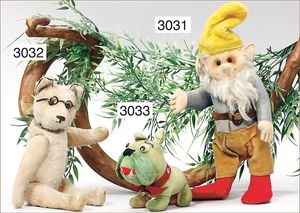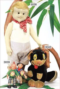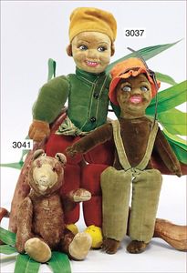 STEIFF Filzfigur, Paul, ca. 1925, mit Knopf, gegliedert, gepunktetes Halsband, 1 Socke ergänzt, Schürze sowie Mütze und Schuhe fehlen, Mama-Stimme nicht funktionstüchtig, eingesetztes Mohair, Filzkörper in gutem Zust.