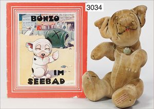 CHAT VALLEY Bonzo, Samt, Gesichtsbemalung in gutem Zust., Kopf, Arme und Beine bewegl. Mit Halsband, "Bonzo reco Harborme", mit Schild an der Fußsohle, 17 cm, dazu 1 Bonzo Heft, im Seebad, Arthur Bold Verlag in Wien, deutsche Verse vom Prinzen Max Löwenstein, 8 Seiten, mit runden Bildern, 14,5 cm hoch, 12 cm breit