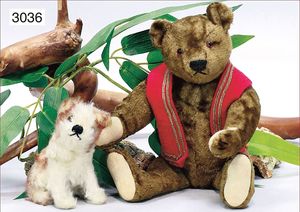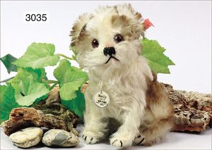 STEIFF Molly, mit Knopf, Schild und Fahne, Nr. 3314, sitzend, bewegl. Kopf, 14 cm, braun geflammtes Fell, schöner Zust.