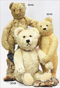 STEIFF Bär, ca. 1920, mit Knopf, Druckbuchstaben, langgezogenes F, Glasaugen, maisfarben, Kahlstelle am re. Arm, Filztatzen in gutem Zust., etwas verstaubt, lange abgeknickte Arme, Buckel, 68 cm, Brummstimme intakt, sehr schöner Ausdruck, ausgef.