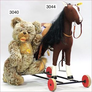 STEIFF Pferd auf Rollen, ca. 1920, 52 cm, Holzräder, Orig.-Sattel, Schweif und Mähne bei Steiff ergänzt, Filz gut