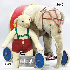 STEIFF Elefant auf Blech-Rädern, 50er Jahre, 62 cm, Zugstimme intakt, Orig.-Decke, Lederbänder am Kopf verschlissen, Mohair gut
