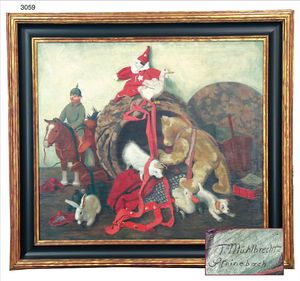 FRITZ MÜHLBRECHT Ölgemälde, * 6/1880 in Belin, +1956, dt. Maler u. Grafiker, Sohn d. preußischen Verlegers u. Buchhändlers Otto Mühlbrecht, ab 1901 studierte er an der Kunstakadmie in München unter Ludwig von Hertrich und Franz von Stuck, Unterlagen über den Maler liegen vor, ca. 1910-1920, signiert, attrakt. Spielzeugszene mit vielen Steifftieren, Soldat, Pferd, Ente auf Holzrädern, Hase, Bär, Clown, 77x87 cm, alterbed. Krakeleebildung, gerahmt, Bild wurde gereinigt und mit neuer Leinwand unterlegt